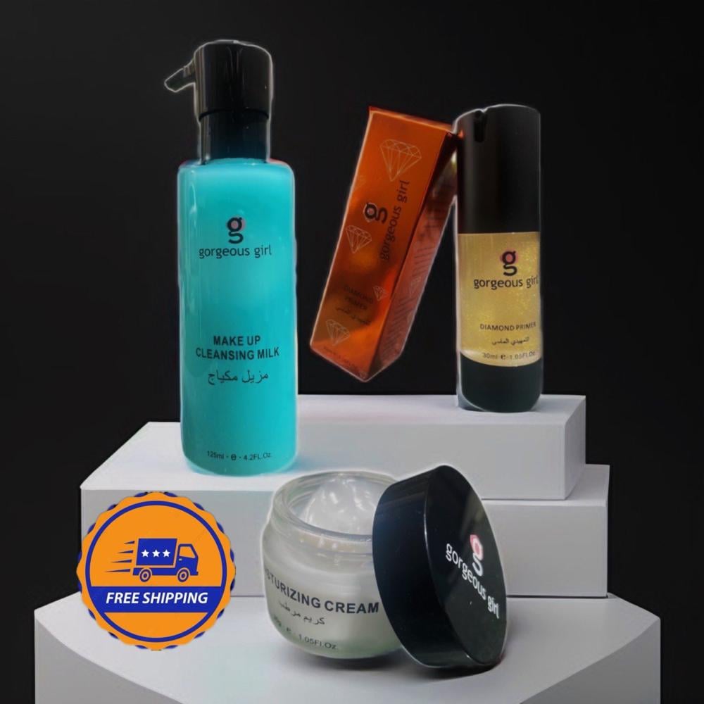 المجموعة الثلاثية الأكثر تميزا للمكياج تحتوى على كريم الترطيب العالي بالنضارة مع قاعدة المكياج البريمر من اجل بشره ناعمه من دون خطوط وتنوير عالي بماء الذهب